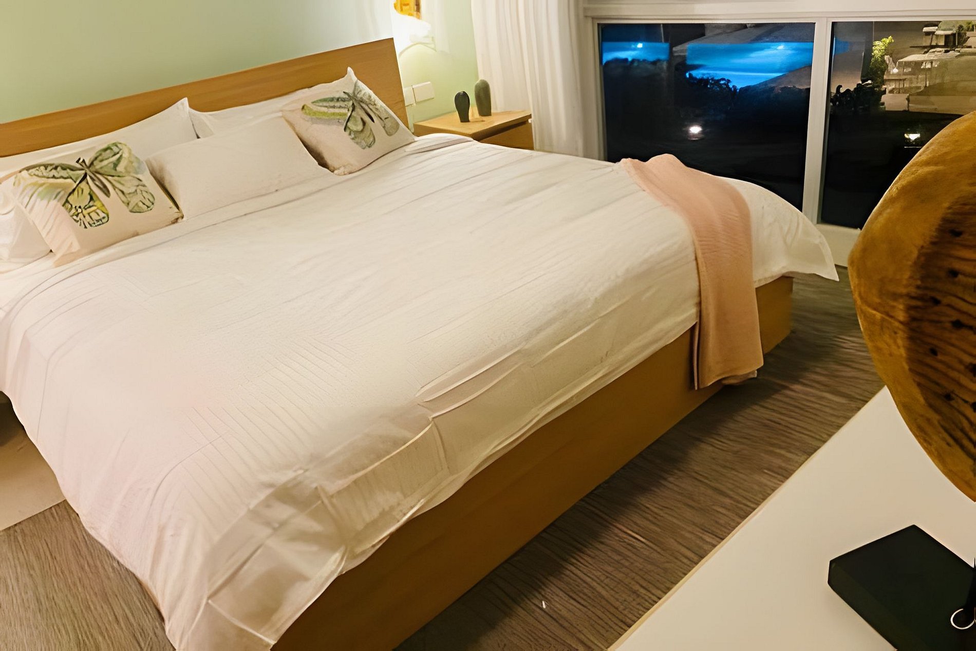 Dos habitaciones amplias cada una con su baño privado, sala y cocina completa, balcón con una hermosa vista a la piscina